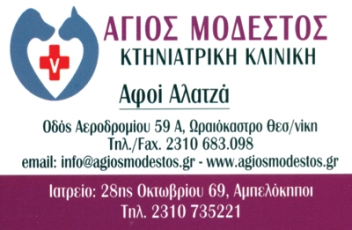 customer tabsΕπικοινωνίαΚτηνιατρεία και Κτηνιατρικές ΚλινικέςΥγείαΑεροδρομίου 59Α, Ωραιόκαστρο, ΘεσσαλονίκηΩΡΑΙΟΚΑΣΤΡΟ ΘΕΣΣΑΛΟΝΙΚΗΣΘΕΣΣΑΛΟΝΙΚΗΜΑΚΕΔΟΝΙΑ 2310683098 2310735221 6947121977 6946979219info@agiosmodestos.grwww.agiosmodestos.gr Το προτείνω (έχει προταθεί 1 φορές) ΦωτογραφίεςFacebook LikeShare on FacebookTweet Widget