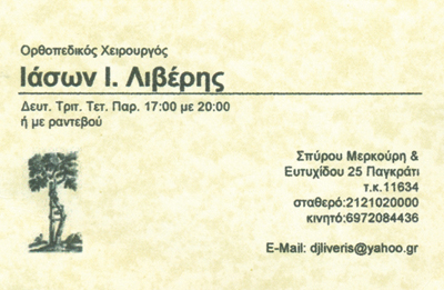customer tabsΕπικοινωνίαΔέχεται 17:30 -20:30 εκτός Πέμπτης Κατόπιν ΡαντεβούΟρθοπεδικοί ΙατροίΥγείαΕυτυχίδου 25, ΠαγκράτιΠΑΓΚΡΑΤΙ ΑΤΤΙΚΗΣΑΤΤΙΚΗΣΤΕΡΕΑ ΕΛΛΑΔΑ 2121020000 6972084436djliveris@yahoo.gr Το προτείνω (έχει προταθεί 0 φορές) ΦωτογραφίεςFacebook LikeShare on FacebookTweet Widget