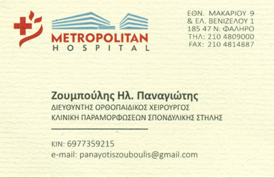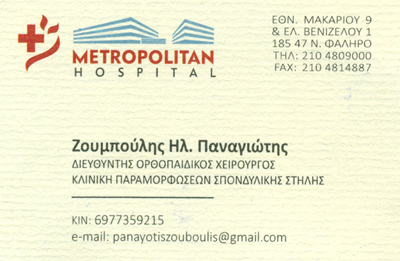 Metropolitan Hospital, Ν. Φάληρο (Διευθυντής Κλινικής Παραμορφώσεων ΣΣ, 2016 – σήμερα)