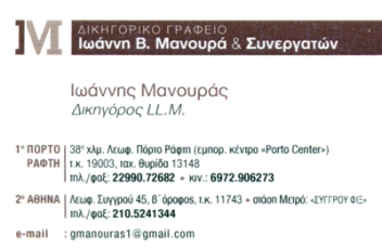 customer tabsΕπικοινωνίαΟ Ιωάννης Β. Μανουράς είναι δικηγόρος Αθηνώνκαι διαπιστευμένος διαμεσολαβητής.Το γραφείο ειδικεύεται σε πληθώρα τομέων δικαίου,με κύριους τομείς ενασχόλησης:Αστικό ΔίκαιοΕμπορικό ΔίκαιοΠοινικό ΔίκαιοΔιοικητικό ΔίκαιοΗ συνεργασία σας με το γραφείο μας, εγγυάται την καλύτερη δυνατή,δικαστική και εξωδικαστική υπεράσπιση τωνδικαιωμάτων και συμφερόντων σας.Η γνώση μας και ο επαγγελματισμός που επιδεικνύουμεστην αντιμετώπιση των υποθέσεών σας,αποτελούν πλεονέκτημα για τη διεκπεραίωση των υποθέσεών σας, με το βέλτιστο τρόπο.Τομείς ειδίκευσης του γραφείου μας είναι το αστικό και το εμπορικό δίκαιο,ενώ οι υπηρεσίες μας επεκτείνονται στον τομέα του ποινικού και διοικητικού δικαίου.2ο Λεωφ. Συγγρού 45, β' όροφος, στάση Μετρό: <<ΣΥΓΓΡΟΥ ΦΙΞ>>, Αθήνα, τ.κ. 11743 Δικηγόροι και Δικηγορικά ΓραφείαΥπηρεσίες1ο 38ο Χλμ. Λεωφ. Πόρτο Ράφτη, (εμπορικό κέντρο <<Porto Center>>), Πόρτο Ράφτη, ταχ. θυρίδα 13148ΠΟΡΤΟ ΡΑΦΤΗ ΑΝΑΤΟΛΙΚΗΣ ΑΤΤΙΚΗΣΑΘΗΝΑ ΑΤΤΙΚΗΣΑΤΤΙΚΗΣΤΕΡΕΑ ΕΛΛΑΔΑ 2299072682 2105241344 697290627322990726822105241344gmanouras1@gmail.comwww.manouraslawyer.gr Το προτείνω (έχει προταθεί 0 φορές) ΦωτογραφίεςFacebook LikeShare on FacebookTweet Widget