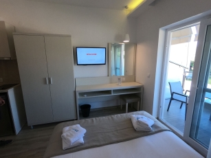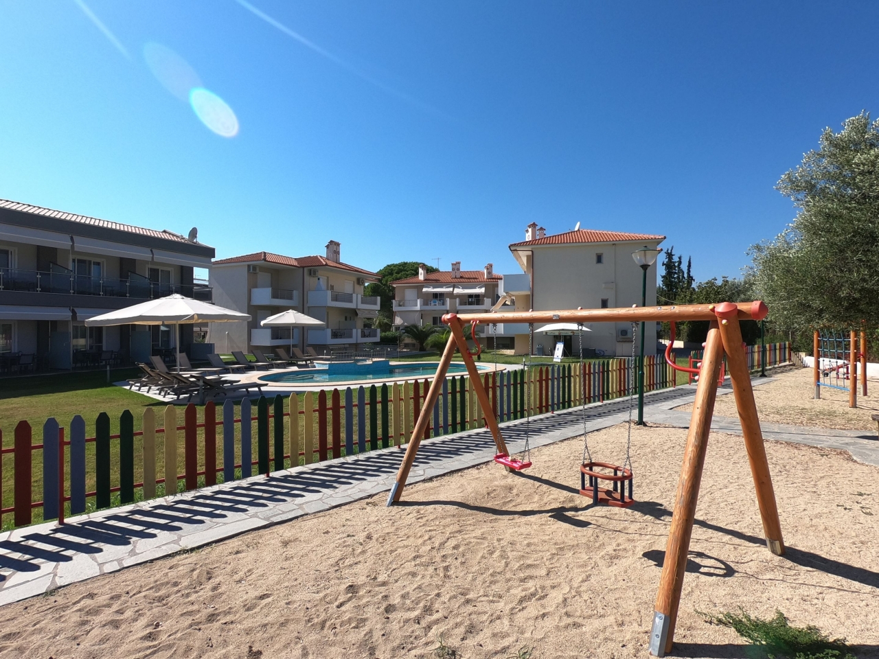 Newly built in 2016/2018, the Finikas Garden Beach Resort Nikiti is located in a green oasis with olive and palm trees. The luxurious equipped apartments with double bed and 2 single beds, kitchen, bathroom, large terrace or balcony provide enough space for up to 4 people. The apartments have either 2 separate rooms and private garden or double rooms surplus lofts and large outdoor balconies. The beach is only 60 meters away. Taverns, cafeterias, shopping facilities are within walking distance. The marina is 600 meters away. The large beach promenade of Nikiti invites for long walks in the evening. The resort is ideal for families with children, due to its quiet location with no traffic. A pool and a playground are planned.