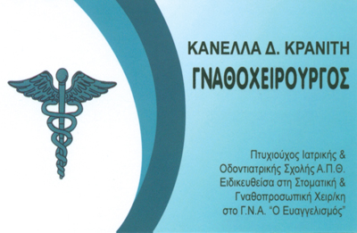customer tabsΕπικοινωνίαΠτυχιούχος Ιατρική & Οδοντιατρικής σχολής Παν/μίου ΘεσσαλονίκηςΣτοματική & Γναθοπροσωπική ΧειρουργικήΕμφυτεύματα - Έγκλειστα Δόντια - ΑκροριζεκτομήΔέχεται καθημερινά με ραντεβού ΓναθοχειρουργοίΥγείαΜανωλοπούλου & Γκοτσινά 10, ΠύργοςΠΥΡΓΟΣ ΗΛΕΙΑΣΗΛΕΙΑΠΕΛΟΠΟΝΝΗΣΟΣ 2621301410 6940409071nkraniti@yahoo.gr Το προτείνω (έχει προταθεί 0 φορές) ΦωτογραφίεςFacebook LikeShare on FacebookTweet Widget