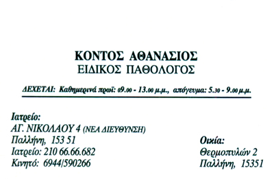 customer tabsΕπικοινωνίαΠαθολόγοιΥγείαΑγίου Νικολάου 4, Παλλήνη, ΑττικήΠΑΛΛΗΝΗ ΑΤΤΙΚΗΣΑΤΤΙΚΗΣΤΕΡΕΑ ΕΛΛΑΔΑ 2106666682kontosath@gmail.com Το προτείνω (έχει προταθεί 0 φορές) ΦωτογραφίεςFacebook LikeShare on FacebookTweet Widget