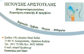 customer tabsΕπικοινωνίαΩτορινολαρυγγολόγοιΥγείαΣταδου 130 ( Πλησίον HOTEL SOFIA), Νέα ΑλικαρνασσόςΝΕΑ ΑΛΙΚΑΡΝΑΣΣΟΣ ΗΡΑΚΛΕΙΟΥΗΡΑΚΛΕΙΟΚΡΗΤΗ 2811751500 6932360568arispet7@yahoo.gr Το προτείνω (έχει προταθεί 0 φορές) ΦωτογραφίεςFacebook LikeShare on FacebookTweet Widget