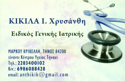 customer tabsΕπικοινωνίαΓενική ΙατρικήΥγείαΜάρκου Κρικέλη, έναντι Κέντρου ΥγείαςΤΗΝΟΣ ΚΥΚΛΑΔΩΝΚΥΚΛΑΔΕΣΝΗΣΙΑ ΑΙΓΑΙΟΥ ΠΕΛΑΓΟΥΣ 2283400102 6986088428anthikik@gmail.com Το προτείνω (έχει προταθεί 0 φορές) ΦωτογραφίεςFacebook LikeShare on FacebookTweet Widget