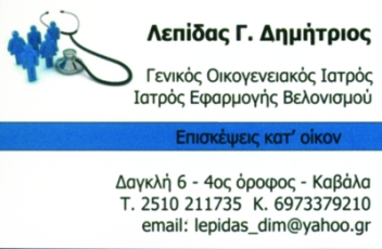 customer tabsΕπικοινωνίαΓενικός Οικογενειακός ΙατρόςΙατρός Εφαρμογής ΒελονισμούΓενική ΙατρικήΥγείαΔαγκλή 6, ΚαβάλαΚΑΒΑΛΑΜΑΚΕΔΟΝΙΑ 2510211735 6973379210lepidas_dim@yahoo.gr Το προτείνω (έχει προταθεί 1 φορές) ΦωτογραφίεςFacebook LikeShare on FacebookTweet Widget