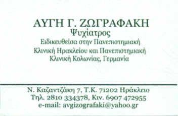 customer tabsΕπικοινωνίαΕιδικευθείς στην Παν/μιακή Κλινική Ηρακλείου & Παν/μιακή Κλινική Κολωνίας, ΓερμανίαΔέχεται καθημερινά με ραντεβούΨυχίατροιΨυχοθεραπευτέςΥγείαΝικ. Καζαντζάκη 7, ΗράκλειοΗΡΑΚΛΕΙΟΚΡΗΤΗ 2810334378 6907472955avgizografaki@yahoo.gr Το προτείνω (έχει προταθεί 0 φορές) ΦωτογραφίεςFacebook LikeShare on FacebookTweet Widget