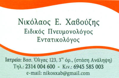 customer tabsΕπικοινωνίαΟ κ. Νικόλαος Χαβούζης είναι Πνευμολογός, Πτυχιούχος της Ιατρικής Σχολής του πανεπιστημίου της Μπολόνια, κάτοχος τίτλου εξειδίκευσης στην Ενταντική Θεραπεία ( ΜΕΘ) και μεταπτυχιακού της Ιατρικής Σχολής του Α.Π.Θ. στην Ιατρική Έρευνα και Μεθολογία.Είναι επιστημονικός συνεργάτης στη Μονάδα Αναπνευστικής Ανεπάρκειας του Νοσ. Γ. Παπανικολάου, Πανεπιστημιακός Υπότροφος της Ιατρικής Σχολής του Α.Π.Θ. και υποψήφιος διδάκτορας με πεδίο έρευνας τις διαταραχές αναπνοής στον ύπνο.Διατηρεί ιδιωτικό Πνευμολογικό Ιατρείο και εργάζεται σε ΜΕΘ ιδιωτικών κλινικών της Θεσσαλονίκης. Πιστοποιημένος στην Ηλεκτρονική Συνταγογράφηση.Πνευμολόγος - Εντατικολόγος ( ΜΕΘ) - Ιατρείο Διακοπής Καπνίσματος - Διαταραχές αναπνοής στον Υπνο - Νευρομυϊκά νοσήματα σε αναπνευστική ανεπάρκεια.Χρόνια Αποφρακτική Πνευμονοπάθεια (Χ.Α.Π.)Άσθμα - Αλλεργική ρινίτιδαΠεριοριστικές ΠνευμονοπάθειεςΠνευμονικές αγγειακές παθήσεις - Πνευμονική ΥπέρτασηΔοκιμασίες Πνευμονικής Λειτουργίας ( Σπιρομέτρηση)ΟξυμετρίαΑναπνευστικές ΛοιμώξειςΔιακοπή ΚαπνίσματοςΔιαταραχές ΎπνουΔιερεύνηση ΔύσπνοιαςΧρόνιος ΒήχαςΜη επεμβατικός μηχανικός αερισμός - νευρομυϊκά νοσήματαΠαρακολούθηση ασθενών σε μηχανικό αερισμό στο σπιτιΔύσπνοια, Ασθμα, Χρόνια Αποφρακτική Πνευμονοπάθεια, Ροχαλητό, Διαταραχές ύπνουΛειτουργικός Έλγχος αναπνοής - Αναπνευστικές ΛοιμώξειςΩράριο: Καθημερινά πρωί και απόγευμα με ραντεβούΠνευμονολόγοι - ΦυματιολόγοιΥγείαΒασ. Όλγας 123, Ανάληψη, ΘεσσαλονίκηΘΕΣΣΑΛΟΝΙΚΗ ΘΕΣΣΑΛΟΝΙΚΗΣΘΕΣΣΑΛΟΝΙΚΗΜΑΚΕΔΟΝΙΑ 2314004600 6945585003nikosxab@gmail.com Το προτείνω (έχει προταθεί 0 φορές) ΦωτογραφίεςFacebook LikeShare on FacebookTweet Widget