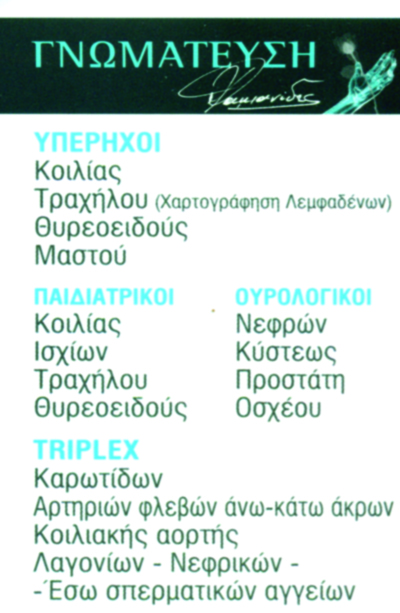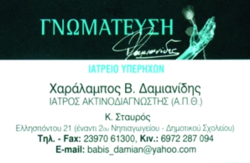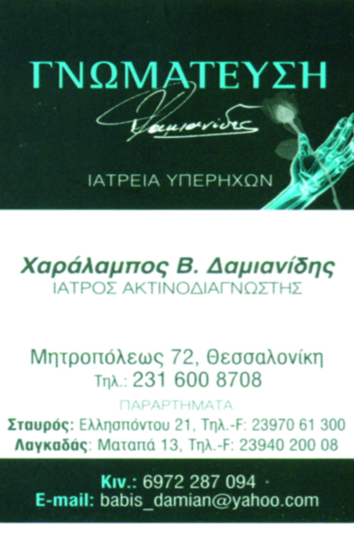 customer tabsΕπικοινωνία1η Διέυθ.: Μητροπόλεως 72, ΘεσσαλονίκηΔέχεται Δευτέρα 20:00-10:00μ.μ.Τετάρτη: 09:00-16:00μ.μ.2η Διέθ.: Ελλησπόντου 21, Σταυρός, Θεσσαλονίκη Δέχεται Πέμπτη 19:00 -21:00μ.μ.Παρασκευή 08:30-13:30μ.μ.3η Διέυθ.: Ματαπά 13, Λαγκαδάς τηλ: 2394020008 Δέχεται Δευτέρα - Τρίτη - Πέμπτη 09:00 -13:00Παρασκευή 17:30 -21:30 Ακτινολόγοι - Ακτινοθεραπευτές - ΡαδιολόγοιΥγείαΜητροπόλεως 72, ΘεσσαλονίκηΣΤΑΥΡΟΣ ΘΕΣΣΑΛΟΝΙΚΗΣΛΑΓΚΑΔΑΣ ΘΕΣΣΑΛΟΝΙΚΗΣΘΕΣΣΑΛΟΝΙΚΗ ΘΕΣΣΑΛΟΝΙΚΗΣΘΕΣΣΑΛΟΝΙΚΗΜΑΚΕΔΟΝΙΑ 2397061300 6972287094 Το προτείνω (έχει προταθεί 1 φορές) ΦωτογραφίεςFacebook LikeShare on FacebookTweet Widget