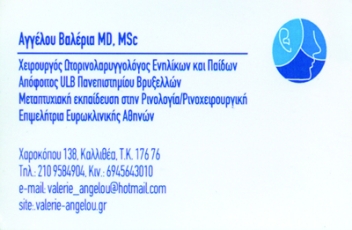 customer tabsΕπικοινωνίαΔέχεται κατόπιν Ραντεβού2η Διεύθυνση: Κύπρου 15, Άλιμος τηλ: 2109960780ΩτορινολαρυγγολόγοιΥγείαΧαροκόπου 138, Καλλιθέα, ΑττικήςΚΑΛΛΙΘΕΑ ΑΤΤΙΚΗΣΑΤΤΙΚΗΣΤΕΡΕΑ ΕΛΛΑΔΑ 2109584904 6945643010valerie_angeloy@hotmail.comwww.valerie-angelou.gr Το προτείνω (έχει προταθεί 0 φορές) ΦωτογραφίεςFacebook LikeShare on FacebookTweet Widget