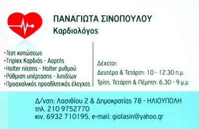 customer tabsΕπικοινωνίαΕιδικός ΚαρδιολόγοςΩράριο: Δευτέρα & Τετάρτη 10:00 -13:00Τρίτη - Τετάρτη - Πέμπτη 18:30 -21:00ΚαρδιολόγοιΥγείαΛασιθίου 2 & Δημοκρατίας 78, Ηλιούπολη, ΑττικήΑΘΗΝΑ ΑΤΤΙΚΗΣΑΤΤΙΚΗΣΤΕΡΕΑ ΕΛΛΑΔΑ 2109752770 6932710195giotasin@yahoo.gr Το προτείνω (έχει προταθεί 0 φορές) ΦωτογραφίεςFacebook LikeShare on FacebookTweet Widget