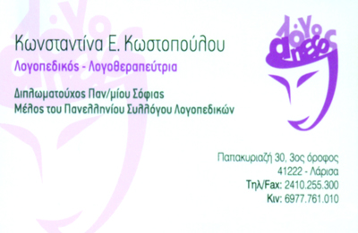 customer tabsΕπικοινωνίαΜαθησιακές ΔυσκολίεςΣυμβουλευτική ΓονέωνΔέχεται καθημερινά με ραντεβούΛογοπεδικοί - ΛογοθεραπευτέςΥγείαΠαπακυριαζή 30, ΛάρισαΛΑΡΙΣΑΘΕΣΣΑΛΙΑ 2410255300 6977761010nadiakostopoulou5@gmail.com Το προτείνω (έχει προταθεί 1 φορές) ΦωτογραφίεςFacebook LikeShare on FacebookTweet Widget