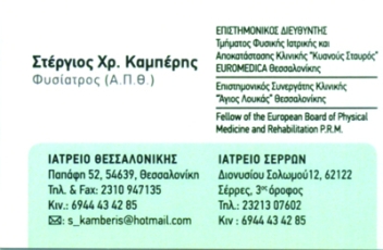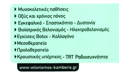 customer tabsΕπικοινωνίαΕΠΙΣΤΗΜΟΝΙΚΟΣ ΔΙΕΥΘΥΝΤΗΣ: Του Τμήματος Φυσικής Ιατρικής & Αποκατάστασης της Κλινικής Κυανούς Σταυρός EUROMEDICA.ΕΠΙΣΤΗΜΟΝΙΚΟΣ ΣΥΝΕΡΓΑΤΗΣ:Του Τμήματος Φυσικής Ιατρικής & Αποκατάστασης της Κλινικής Άγιος Λουκάς Πανοράματος Θεσσαλονίκης.Της Κλινικής Κυανούς Σταυρός EUROMEDICA Θεσσαλονίκης.Του Κέντρου Εξωσωματικής Γονιμοποίησης «ΙΑΚΕΝΤΡΟ» Θεσσαλονίκης. ΕΠΙΣΤΗΜΟΝΙΚΟΣ ΥΠΕΥΘΥΝΟΣ:Ιατρείου Εγκεφαλικών-Σπαστικότητας-Δυστονίας (Αγγειακού Εγκεφαλικού Επεισοδίου, Αυχενικής Δυστονίας, Σπαστικού Ραιβόκρανου, Εγκεφαλικής Παράλυσης) εγχύσεις BOTOX - DYSPORT στην Κλινική Άγιος Λουκάς και στην Κλινική Κυανούς Σταυρός EUROMEDICA Θεσσαλονίκης.Ιατρείου Αποκατάστασης Μυοσκελετικών Παθήσεων στην Κλινική Άγιος Λουκάς.Ιατρείου Βιοϊατρικού Βελονισμού (Πόνου, Μυοσκελετικών Παθήσεων-Αθλητικών Κακώσεων, Διακοπή Καπνίσματος-Έλεγχος της Όρεξης, Ενεργοποίηση του Μεταβολισμού) στην Κλινική Άγιος Λουκάς και στην Κλινική Κυανούς Σταυρός EUROMEDICA Θεσσαλονίκης. ΕΥΡΩΠΑΙΚΟΣ ΤΙΤΛΟΣ: Fellow of the European Board of Physical Medicine and Rehabilitation P.R.M. (European Board Certification) ΜΕΛΟΣ ΕΤΑΙΡΕΙΩΝ: Ελληνική Εταιρεία Φυσικής Ιατρικής & Αποκατάστασης, International Society of Physical and Rehabilitation Medicine (ISPRM), Ελληνική εταιρία Αλγολογίας, Ελληνική Ιατρική Εταιρεία Βελονισμού, Ιατρική Εταιρία Βελονισμού Βορείου ΕλλάδοςΙατρικός Βελονισμός, Μεσοθεραπεία, Κρουστικός Έλεγχος,Στοχευμένες θεραπείες με ραδιοσυχνότητεςΔέχεται με ραντεβούΦυσίατροιΙατροί ΒελονιστέςΒελονισμόςΥγείαΠαπάφη 52, (έναντι Παπάφειου Ιδρύματος), ΘεσσαλονίκηΓεώργιου Παπανδρέου, Νέα ΜουδανιάΘΕΣΣΑΛΟΝΙΚΗ ΘΕΣΣΑΛΟΝΙΚΗΣΝΕΑ ΜΟΥΔΑΝΙΑ ΧΑΛΚΙΔΙΚΗΣΘΕΣΣΑΛΟΝΙΚΗΜΑΚΕΔΟΝΙΑΧΑΛΚΙΔΙΚΗ 2310947135 2373400048 69444342852310947135s_kamperis@hotmail.comwww.velonismos-kamberis.grwww.velonismos-kamberis.gr ΦΥΣΙΑΤΡΟΣ ΙΑΤΡΕΙΟ ΘΕΣΣΑΛΟΝΙΚΗΣ ΚΑΙ Ν. ΜΟΥΔΑΝΙΩΝ Το προτείνω (έχει προταθεί 0 φορές) ΦωτογραφίεςFacebook LikeShare on FacebookTweet Widget