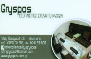 customer tabsΕπικοινωνίαH εταιρεία GRYSPOS εξοπλίζει τον επαγγελματικό σας χώρο με τις πιο σύγχρονες και μοντέρνες λύσεις. Σε εμάς θα βρείτε ολόκληρο τον εξοπλισμό επίπλων που χρειάζεται ένα στούντιο νυχιών όπως το έχετε φανταστεί! Κατασκευάζουμε και εμπορευόμαστε γραφεία για μανικιούρ, λειτουργικά και με ενσωματωμένο άψογο φωτισμό, άνετες πολυθρόνες πεντικιούρ και κομψούς νιπτήρες. Υπάρχουν πολλές ιδέες και ποικίλες λύσεις για κάθε χώρο σύμφωνα με τα χρώματα και την αισθητική που σας αρμόζει και προτιμάτε. Επίσης προσφέρουμε καθίσματα επαγγελματικών χώρων και αναλαμβάνουμε κατασκευές επίπλων όπως ράφια και πάγκους εργασίας και υποδοχής για να κάνουν το χώρο σας ακόμα πιο λειτουργικό! Επικοινωνήστε μαζί μας για ιδέες, λύσεις και τις καλύτερες τιμές τις αγοράς!johngryspos@hotmail.com Έπιπλα ΓενικάΈπιπλα ΓραφείουΕπαγγελματικός ΕξοπλισμόςΔόμηση - ΚατοικίαΛοιπάΑλεξάνδρου Παναγούλη 33, ΗλιούποληΗΛΙΟΥΠΟΛΗ ΑΤΤΙΚΗΣΑΤΤΙΚΗΣΤΕΡΕΑ ΕΛΛΑΔΑ 2109705385 6974470697 6944631500cristosgruspos@hotmail.comjohngryspos@hotmail.comwww.gryspos.com.grhttps://www.facebook.com/eksoplismos.by.gryspos Το προτείνω (έχει προταθεί 0 φορές) ΦωτογραφίεςFacebook LikeShare on FacebookTweet Widget