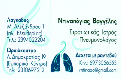customer tabsΕπικοινωνίαΣτρατιωτικός ΙατρόςΛειτουργικός έλεγχος αναπνοής - Άσθμα - ΧΑΠ - Υπνική άπνοια - Αναπνευστικές Λοιμώξεις - Διακοπή ΚαπνίσματοςΛειτουργικές δοκιμασίες πνευμόνων, (σπιρομέτρηση)Έλεγχος αλλεργιών του αναπνευστικούΈλεγχος συνδρόμων απνοιών στον ύπνοΔέχεται με ραντεβού, Κατ'οίκον επισκέψεις2o Ιατρείο: Λ. Δήμοκρατίας 19, Ωραίοκαστρο Πνευμονολόγοι - ΦυματιολόγοιΥγείαΜεγ. Αλεξάνδρου 1, Λαγκαδάς, ΘεσσαλονίκηΛΑΓΚΑΔΑΣ ΘΕΣΣΑΛΟΝΙΚΗΣΘΕΣΣΑΛΟΝΙΚΗΜΑΚΕΔΟΝΙΑ 2394022204 2310697212 6973056553vntinapo@gmail.com Το προτείνω (έχει προταθεί 0 φορές) ΦωτογραφίεςFacebook LikeShare on FacebookTweet Widget