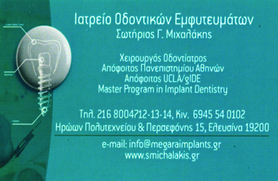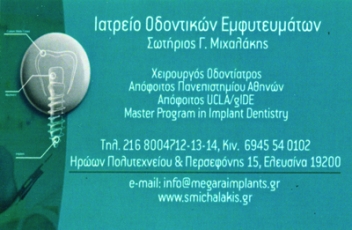 customer tabsΕπικοινωνίαΧειρουργός Οδοντίατρος Απόφοιτος Πανεπιστημίου ΑθηνώνΑπόφοιτος UCLA/gIDEMaster Program in Implant Dentistry2o Ιατρείο: Περσεφόνης 15 & Ηρ. Πολυτεχνείου, Ελευσίνα,τηλ.: 2168004712-13-14, κιν.: 6945540102Χειρουργοί ΟδοντίατροιΥγείαΓ. Μαυρουκάκη 34, Μέγαρα, ΑττικήΜΕΓΑΡΑ ΑΤΤΙΚΗΣΑΤΤΙΚΗΣΤΕΡΕΑ ΕΛΛΑΔΑ 2296023633 2168004712 6945540102info@megaraimplants.grwww.megaraimplants.gr Το προτείνω (έχει προταθεί 0 φορές) ΦωτογραφίεςFacebook LikeShare on FacebookTweet Widget