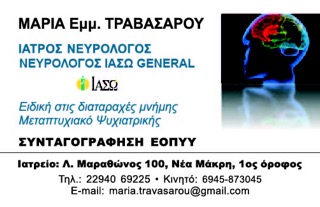 customer tabsΕπικοινωνίαΑπόφοιτος εθνικού Καποδιστριακού Πανεπιστημίου ΑθηνώνΕξειδίκευση στην άνοια (διαταραχή μνήμης)Μεταπτυχιακό στην ψυχιατρικήΕπιστημονικός συνεργάτης νοσοκομείου ΓεννηματάΣυνταγογράφηση ΕΟΠΥΥΝευρολόγοιΝευρολόγοι - ΨυχίατροιΥγείαΛεωφ. Μαραθώνος 100, Νέα ΜάκρηΝΕΑ ΜΑΚΡΗ ΑΤΤΙΚΗΣΑΤΤΙΚΗΣΤΕΡΕΑ ΕΛΛΑΔΑ 2294069225 6945873045maria.travasarou@gmail.com Το προτείνω (έχει προταθεί 0 φορές) ΦωτογραφίεςFacebook LikeShare on FacebookTweet Widget
