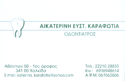 customer tabsΕπικοινωνίαΔέχεται καθημερινά 09:00 -13:00 απόγευμα με ραντεβούΧειρουργοί ΟδοντίατροιΥγείαΑβάντων 50, ΧαλκίδαΧΑΛΚΙΔΑ ΕΥΒΟΙΑΣΕΥΒΟΙΑΣΤΕΡΕΑ ΕΛΛΑΔΑ 2221028833 6936948614katerina_karafotia@yahoo.com Το προτείνω (έχει προταθεί 0 φορές) ΦωτογραφίεςFacebook LikeShare on FacebookTweet Widget