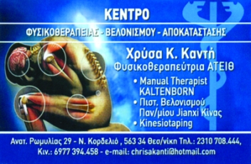 customer tabsΕπικοινωνίαΦυσικοθεραπεύτρια ΑΤΕΙΘ - Εναλλακτική Θεραπεία - ΒελονισμόςΑθλητικές Κακώσεις - Μυοσκελετικές Κακώσεις - Ρευματολογικές ΠαθήσειςManual Therapist KALTENBORNΠιστ. Βελονισμού Πανεπιστημίου Jianxi ΚίναςKinesiotapingΚινέζικος Βελονισμός Διάγνωση/ΘεραπείαΑυχενικό Σύνδρομο, Πονοκέφαλοι, ΟσφυαλγίαΙσχιαλγία, Περιαθρίτιδες, ΟστεοαρθρίτιδεςΤενοντίτιδες, Αθλητικές κακώσεις, Κακώσεις περιφ. νεύρωνΔιακοπή καπνίσματος, Αδυνάτισμα - Παχυσαρκία, Δυσκοιλιότητα , ΥπέρτασηΦυσικοθεραπευτέςΕναλλακτικές ΘεραπείεςΥγείαΑνατολικής Ρωμυλιάς 29, Κορδελιό, ΘεσσαλονίκηΕΛΕΥΘΕΡΙΟ ΚΟΡΔΕΛΙΟ ΘΕΣΣΑΛΟΝΙΚΗΣΘΕΣΣΑΛΟΝΙΚΗΜΑΚΕΔΟΝΙΑ 2310708444 6977394458chrisakanti@hotmail.com Το προτείνω (έχει προταθεί 0 φορές) ΦωτογραφίεςFacebook LikeShare on FacebookTweet Widget