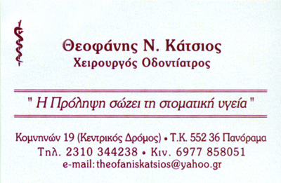 customer tabsΕπικοινωνίαΑισθητική ΟδοντιατρικήΠροσθετική ΕμφυτευμάτωνΠροβλήματα ΠεριοδοντολογίαςΠαιδοδοντιατρικές Εργασίες2o Ιατρείο: Ι. Μετάξα 7, Λεπτοκαρυά, τηλ: 2352301605Χειρουργοί ΟδοντίατροιΠεριοδοντολόγοιΥγείαΚομνηνών 19, Πανόραμα, ΘεσσαλονίκηςΘΕΣΣΑΛΟΝΙΚΗ ΘΕΣΣΑΛΟΝΙΚΗΣΘΕΣΣΑΛΟΝΙΚΗΜΑΚΕΔΟΝΙΑ 2310344238 6977858051theokatsios@hotmail.comtheofaniskatsios@yahoo.gr Το προτείνω (έχει προταθεί 0 φορές) ΦωτογραφίεςFacebook LikeShare on FacebookTweet Widget