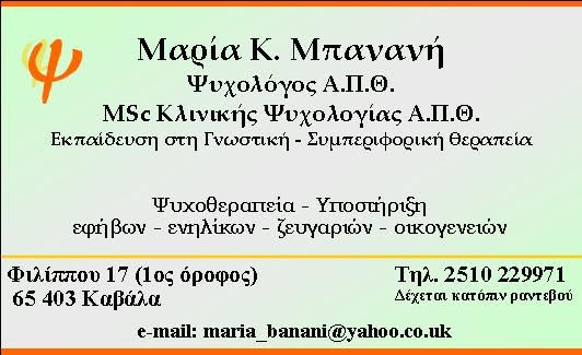 customer tabsΕπικοινωνίαΨυχολόγος Α.Π.Θ.MSc Κλινικής Ψυχολογίας Α.Π.Θ.Εκπαίδευση στην Γνωστική - Συμπεριφορική θεραπείαΣυμβουλευτική Ζευγαριών - Εφήβων - ΕνηλίκωνΨυχοθεραπεία - Υποστήριξη εφήβων - ενηλίκων - ζευγαριών - οικογενειών.Άγχος - Στρές- ΚατάθλιψηΔέχεται κατόπιν ΡαντεβούΨυχολόγοιΥγείαΦιλίππου 17, 1ος όροφος, ΚαβάλαΚΑΒΑΛΑ ΚΑΒΑΛΑΣΚΑΒΑΛΑΜΑΚΕΔΟΝΙΑ 2510229971maria_banani@yahoo.com.uk Το προτείνω (έχει προταθεί 0 φορές) ΦωτογραφίεςFacebook LikeShare on FacebookTweet Widget