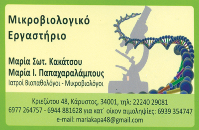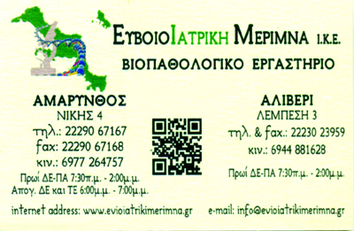 customer tabsΕπικοινωνία2. Νίκης 4, Αμάρυνθος (Ευβοιατρική Μέριμνα), τηλ:2229061767, φάξ: 2229067168Πρωί ΔΕ - ΠΑ 07:30-14:00Απογ. ΔΕ και ΤΕ 18:00-19:003. Λεμπέση 3, Αλιβέρι (Ευβοιατρική Μέριμνα) τηλ& φάξ: 2223023959mariapapa@gmail.comΠρωί ΔΕ - ΠΑ 07:30-14:00Site:http://www.evioiatrikimerimna.gr/E-mail: info@evioiatrikimerimna.grΜικροβιολόγοι - ΒιοπαθολόγοιΥγείαΚριεζώτου 48, ΚάρυστοςΚΑΡΥΣΤΟΣ ΕΥΒΟΙΑΣΑΛΙΒΕΡΙ ΕΥΒΟΙΑΣΑΜΑΡΥΝΘΟΣ ΕΥΒΟΙΑΣΕΥΒΟΙΑΣΤΕΡΕΑ ΕΛΛΑΔΑ 2224029081 2229067167 6977264757 694488162822290671682223023959info@mariapapa.grmariapapa@gmail.commariakapa48@gmail.cominfo@evioiatrikimerimna.grwww.biolabskarystou.grwww.evioiatrikimerimna.gr Το προτείνω (έχει προταθεί 0 φορές) ΦωτογραφίεςFacebook LikeShare on FacebookTweet Widget