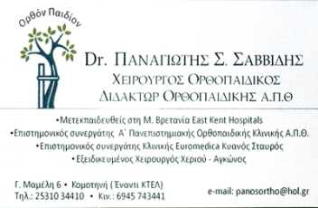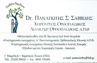 customer tabsΕπικοινωνίαΔιδάκτωρ ΟρθοπεδικήςΣυνεργάτης Α΄Πανεπιστιμιακής Ορθοπεδικής Κλινικής Αριστοτέλειου Πανεπιστημίου ΘεσσαλονίκηςΕξειδικευμένος Χειρούργος ΧεριούΕπιστημονικός Συνεργάτης Α΄Πανεπιστημιακής Ορθοπεδικής Α.Π.Θ.Χειρουργός στην Κλινική Euromedica Κυανού Σταυρού, τηλ: 2310966000, kianous@euromedica.gr, www.euromedica.grΔέχεται Πέμπτη & Παρασκευή με ΡαντεβούΔευτέρα & Τρίτη Κυανούς Σταυρός ΘεσσαλονίκηςΤετάρτη Νοσοκομείου Πανανικολάου2o Ιατρείο : Βασ. Ηρακλείου 21, ΘεσσαλονίκηΒιογραφικόΓεννημένος 1969, αριστούχος απόφοιτος του 2ου Λυκείου Κομοτηνής.Εισαγωγή με Πανελλαδικές εξετάσεις το 1987 στην Ιατρική Α.Π.Θ., αποφοίτηση το 1993.Ειδικότητα στο Ιπποκράτειο Θεσσαλονίκης - Τίτλος Ειδικότητος Μάρτιος 2003.Μετεκπαίδευση στη Μ. Βρεττανία απο το Ιούλιο του 2004 έως το Δεκέμβριο του 2007 στη χειρουργίκη χεριού αγκώνων καιστις ολικές αρθροπλαστικές κάτω άκρονΧειρούργοι ΟρθοπεδικοίΥγείαΓεωργίου Μαμέλη 6α, Κομοτηνή, ΡοδόπηΚΟΜΟΤΗΝΗ ΡΟΔΟΠΗΣΘΕΣΣΑΛΟΝΙΚΗ ΘΕΣΣΑΛΟΝΙΚΗΣΡΟΔΟΠΗΘΡΑΚΗΘΕΣΣΑΛΟΝΙΚΗΜΑΚΕΔΟΝΙΑ 2531034410 6945743441panosortho@hol.gr Το προτείνω (έχει προταθεί 1 φορές) ΦωτογραφίεςFacebook LikeShare on FacebookTweet Widget