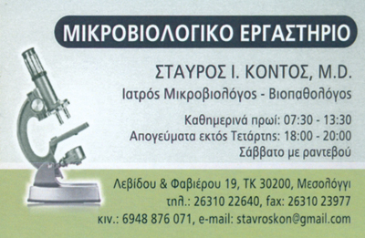 customer tabsΕπικοινωνίαΑιμοληψίες Κατ'οίκονΔέχεται Καθημερινά πρωί: 07:30-13:30Απογεύματα εκτός Τετάρτης: 18:00-20:00Σάββατο με ραντεβούΜικροβιολόγοι - ΒιοπαθολόγοιΥγείαΦαβιέρου 19, Μεσολόγγι, ΑιτωλοακαρνανίαΜΕΣΟΛΟΓΓΙ ΑΙΤΩΛΟΑΚΑΡΝΑΝΙΑΣΑΙΤΩΛΟΑΚΑΡΝΑΝΙΑΣΤΕΡΕΑ ΕΛΛΑΔΑ 2631022640 69488760712631023977stavroskon@gmail.com Το προτείνω (έχει προταθεί 0 φορές) ΦωτογραφίεςFacebook LikeShare on FacebookTweet Widget