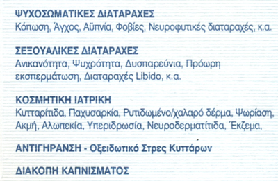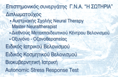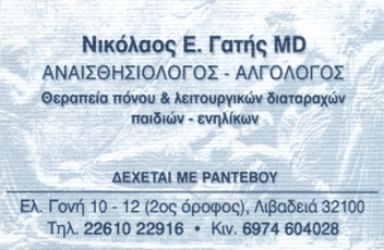 customer tabsΕπικοινωνίαΘεραπεία πόνου & Λειτουργικών διαταραχών.Επιστημονικός συνεργάτης νοσοκομείου ΓΝΝΘ Σωτηρία Αθηνών.Βελονισμός, οξυγόνο, οζονοθεραπεία, Neural Therapy.Δέχεται πρωί και απόγευμα με ραντεβού.ΑναισθησιολόγοιΥγείαΕλ. Γόνη 12, Λιβαδειά, ΒοιωτίαΛΙΒΑΔΕΙΑ ΒΟΙΩΤΙΑΣΒΟΙΩΤΙΑΣΤΕΡΕΑ ΕΛΛΑΔΑ 2261022916 6974604028nikgatis@hotmail.com Το προτείνω (έχει προταθεί 0 φορές) ΦωτογραφίεςFacebook LikeShare on FacebookTweet Widget