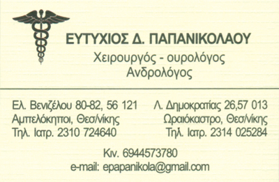customer tabsΕπικοινωνίαΟυρολόγος - Ανδρολόγος2ο Ιατρείο: Λεωφόρος Δημοκρατίας 26, Ωραιόκαστρο, ΘεσσαλονίκηΔέχεται : Τρίτη & Πέμπτη 11:00 -14:00Αμπελόκηποι Δέχεται Καθημερινά 11:00-14:00Τρίτη & Πέμπτη 18:00-21:00 Ουρολόγοι - ΑνδρολόγοιΥγείαΕλ. Βενιζέλου 80 - 82, Αμπελόκηποι, ΘεσσαλονίκηςΑΜΠΕΛΟΚΗΠΟΙ ΑΤΤΙΚΗΣΑΤΤΙΚΗΣΤΕΡΕΑ ΕΛΛΑΔΑ 2310724640 2314025284 6944573780epapanikola@gmail.com Το προτείνω (έχει προταθεί 8 φορές) ΦωτογραφίεςFacebook LikeShare on FacebookTweet Widget