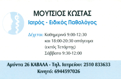 customer tabsΕπικοινωνίαΔέχεται καθημερινά 09:00 -13:00 & 18:00 -20:00 εκτός Τετάρτης με ραντεβούΠαθολόγοιΥγείαΑμυντά 26, ΚαβάλαΚΑΒΑΛΑ ΚΑΒΑΛΑΣΚΑΒΑΛΑΜΑΚΕΔΟΝΙΑ 2510833633 69445970262510833633bossk.27@hotmai.com Το προτείνω (έχει προταθεί 0 φορές) ΦωτογραφίεςFacebook LikeShare on FacebookTweet Widget