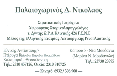 customer tabsΕπικοινωνίαΟ χειρουργός ωτορινολαρυγγολόγος Παλαιοχωρινός Νικόλαοςείναι απόφοιτος της Στρατιωτικής Ιατρικής Σχολής. Τα έτη 1988 και 1989 υπηρέτησε στο 401 Γ.Σ.Ν.Α ως επιμελητής.Διετέλεσε Διοικητής Υγειονομικής Μονάδας στις πόλεις της Καστοριάςκαι του Λιτόχωρου.Από το 1997 και μετά ο γιατρός διετέλεσε Διευθυντής Ωτορινολαρρυγγολογικής κλινικής στο 404 Στρατιωτικό Νοσοκομείο Λάρισας, Επιμελητής στο 424 ΓΣΝΕ, Διευθυντής ΩΡΛ κλινικήςστο Στρατιωτικό Νοσοκομείο Ξάνθης καθώς και Διευθυντής ΩΡΛκλινικής στο 424 ΓΣΝΕ.Το ιατρείο του χειρουργού ωτορινολαρυγγολόγου Παλαιοχωρινού Νικόλαου στην Καλαμαριά Θεσσαλονίκης, λειτουργεί από το 1990 με ιδιαίτερη εξειδίκευση στη χειρουργική ρινός και τις άπνοιες ύπνου (ροχαλητό).Ο χειρουργός ωτορινολαρυγγολόγος κ. Παλαιοχωρινός είναι ιδρυτικό μέλος της Ελληνικής Εταιρείας Χειρουργικής Ρινοπλαστικής.Εξειδίκευση στη χειρουργική ρινόςΑντιμετώπιση απνοιών ύπνουΑντιμετώπιση αλλεργικής ρινίτιδαςΠλήρης ωτορινολαρυγγολογικός έλεγχοςΕνδοσκοπική εξέτασηΠαιγνιδοακουομετρία - παιδικός ακουολογικός έλεγχος1ο Ιατρείο: Λεωφ. Εθνικής Αντιστάσεως 7Β, Καλαμαριά - Θεσσαλονίκη2ο ιατρείο: Κύπρου 5, Νέα Μουδανιά ΧαλκιδικήςΔέχεται Δευτέρα - Τετάρτη - Παρασκευή 09:00 -13:00Σάββατο με ραντεβού ΩτορινολαρυγγολόγοιΥγεία1. Κύπρου 5, Μαρίνα Νέα Μουδανιά Χαλκιδικής /2. Λεωφ. Εθνικής Αντιστάσεως 7Β, Καλαμαριά - ΘεσσαλονίκηΝΕΑ ΜΟΥΔΑΝΙΑ ΧΑΛΚΙΔΙΚΗΣΚΑΛΑΜΑΡΙΑ ΘΕΣΣΑΛΟΝΙΚΗΣΧΑΛΚΙΔΙΚΗΜΑΚΕΔΟΝΙΑΘΕΣΣΑΛΟΝΙΚΗ 2373023995 2310457126 2310810725 Οικίας 6932306900info@palaioxorinos-orl.grhttp://www.palaioxorinos-orl.gr/ Το προτείνω (έχει προταθεί 1 φορές) ΦωτογραφίεςFacebook LikeShare on FacebookTweet Widget
