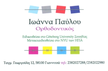 customer tabsΕπικοινωνίαΠαύλου Ιωάννα: ΟρθοδοντικόςΠαύλου Μαρία: ΟδοντίατροςΔέχεται καθημερινά κατόπιν ραντεβούΠρωί & Απόγευμα εκτός Τετάρτης ΑπογεύματοςΟρθοδοντικοίΟδοντίατροιΥγείαΤαγματάρχη Γεωργούλη 12, Γιαννιτσά, ΠέλλαΓΙΑΝΝΙΤΣΑ ΠΕΛΛΑΣΠΕΛΛΑΜΑΚΕΔΟΝΙΑ 2382022980 2382027288changeyoursmile@yahoo.grwww.pavlou-orthodontics.gr Το προτείνω (έχει προταθεί 0 φορές) ΦωτογραφίεςFacebook LikeShare on FacebookTweet Widget