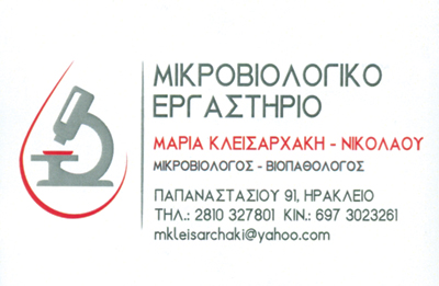 customer tabsΕπικοινωνίαΑιμοληψίες Κατ' οίκονΣύμβαση ΕΟΠΥΥκαι όλα τα ταμεία Ένοπλων ΔυνάμεωνΜικροβιολόγοιΥγείαΠαπαναστασίου 123, ΗράκλειοΗΡΑΚΛΕΙΟΚΡΗΤΗ 2810327801 6973023261mkleisarchaki@yahoo.com Το προτείνω (έχει προταθεί 0 φορές) ΦωτογραφίεςFacebook LikeShare on FacebookTweet Widget