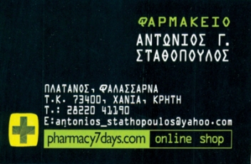 customer tabsΕπικοινωνίαΦαρμακείαΥγείαΠλάτανος, Φαλάσαρνα, ΧανιάΧΑΝΙΑΚΡΗΤΗ 2822041190 6932443114antonios_stathopoulos@yahoo.comwww.pharmacy7days.com Το προτείνω (έχει προταθεί 0 φορές) ΦωτογραφίεςFacebook LikeShare on FacebookTweet Widget
