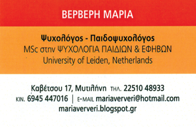 Επιστρέφοντας στην Ελλάδα, άνοιξε το δικό της γραφείο (το 2010) στην Μυτιλήνη. Το γραφείο της κ. Βερβέρη παρέχει όλες τις υπηρεσίες ψυχολογικής και συμβουλευτικής υποστήριξης του παιδιού, του εφήβου, της οικογένειας και του ενήλικα.