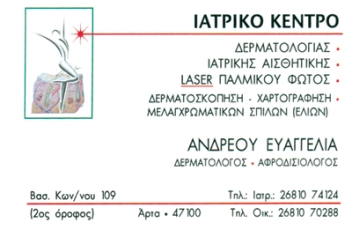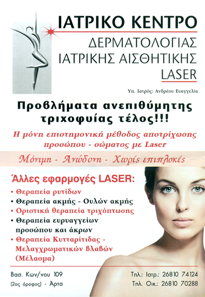 customer tabsΕπικοινωνίαΘεραπεία αντιγήρανσης με ενέσιμα εμφυτεύματα υαλουρονικού οξέως,Θεραπείες αντιγήρανσης με υπερήχουςΔέχεται καθημερινά 09:00 -13:00 και 18:00 -20:00 εκτός Τετάρτης Απογεύματος και ΣάββατοΔερματολόγοι - ΑφροδισιολόγοιΥγείαΒασ. Κωνσταντινου 109, ΆρταΑΡΤΑΗΠΕΙΡΟΣ 2681074124 2681070288 οικίαςandreoueva@hotmail.gr Το προτείνω (έχει προταθεί 0 φορές) ΦωτογραφίεςFacebook LikeShare on FacebookTweet Widget