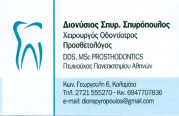 customer tabsΕπικοινωνίαΧειρ. ΟδοντίατροςΠροσθετολόγοςΔέχεται καθημερινά 09:00 -14:00 και 18:00 -21:00 εκτός Τετάρτης Απογεύματος Χειρουργοί ΟδοντίατροιΥγείαΚων. Γεωργούλη 6, Καλαμάτα, ΜεσσηνίαΚΑΛΑΜΑΤΑ ΜΕΣΣΗΝΙΑΣΜΕΣΣΗΝΙΑΠΕΛΟΠΟΝΝΗΣΟΣ 2721555270 6947707836dionspyropoulos@gmail.com Το προτείνω (έχει προταθεί 0 φορές) ΦωτογραφίεςFacebook LikeShare on FacebookTweet Widget