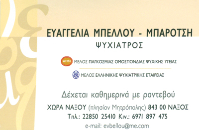 customer tabsΕπικοινωνίαΔέχεται καθημερινά πρωί και απόγευμα με ραντεβούΨυχώσεις, κατάθλιψη, διπολική διαταραχή,Διαταραχές άγχους - ύπνου - μνήμης - προσωπικότητας.ΨυχίατροιΥγείαΧώρα, Νάξος, ΚυκλάδεςΝΑΞΟΣ ΚΥΚΛΑΔΩΝΚΥΚΛΑΔΕΣΝΗΣΙΑ ΑΙΓΑΙΟΥ ΠΕΛΑΓΟΥΣ 2285025410 69718974752285025410evbellou@me.com Το προτείνω (έχει προταθεί 0 φορές) ΦωτογραφίεςFacebook LikeShare on FacebookTweet Widget