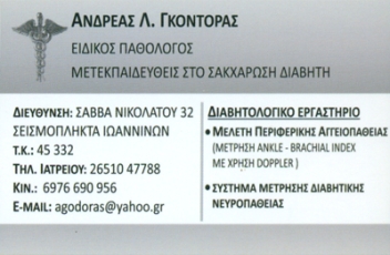 customer tabsΕπικοινωνίαΕιδικός παθολόγος, μετεκπαιδευθείς στην διαβητολογία.Στο ιατρείο λειτουργεί διαβητολογικό εργαστήριο, σύστημα μέτρησης διαβητικής νευροπάθειας,μελέτη περιφερικής αγγειοπάθειας ( μέτρηση Ankle - Brachial Index με χρήση Doppler ),διαγωστικό τέστ ανίχνευσης, διαβητικής νεφροπάθειας.Δέχεται καθημερινά 09:00 -13:30 και 18:00 -20:30 εκτός ΤετάρτηςΠαθολόγοιΥγείαΣάββα Νικολάτου 32 (Σεισμόπληκτα), ΙωάννιναΙΩΑΝΝΙΝΑΗΠΕΙΡΟΣ 2651047788 6976690956agodoras@yahoo.gr Το προτείνω (έχει προταθεί 1 φορές) ΦωτογραφίεςFacebook LikeShare on FacebookTweet Widget