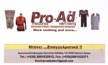 customer tabsΕπικοινωνίαΕργασιακό Ένδυμα - Στολές - Διαφημιστικές ΕφαρμογέςΞενοδοχειακός Εξοπλισμός - Σχολικές και Αθλητικές ΕμφανίσειςΙερατικά Ενδύματα - Αποκριάτικες ΣτολέςPro-Ad, για κάθε είδους ένδυμα εργασίας, διαφημιστικό ένδυμα, αλλά και κάθε είδος επαγγελματικού ιματισμού. Εμείς στην Pro-Ad :Καινοτομούμε, κατασκευάζοντας επί τόπου, στις ιδιόκτητες εγκαταστάσεις μας κάθε είδος, προσαρμοσμένο στις απόλυτες ανάγκες των πελατών μας (custom-made).Πρωτοπορούμε παράγοντας περισσότερα από 1000 διαφορετικά είδη.Είμαστε εκτός ανταγωνισμού γιατί κρατάμε τις τιμές μας ίδιες και κάθε χρόνο συμφερότερες.Ξεχωρίζουμε με διαρκείς συνεργασίες σε δημόσιο και ιδιωτικό τομέα.Συνεχίζουμε με αναβαθμισμένες υπηρεσίες και προϊόντα.Γιατί για εμάς η καλύτερη διαφήμιση γίνεται από τους ίδιους τους πελάτες μας ! Στολές και Ενδυμασίες Επαγγελματικές - Εργασίας και ΓυμναστικήςΣτολέςΛοιπάΣκλαβεροχώρι Πεδιάδος, Καστέλλι, ΗράκλειοΗΡΑΚΛΕΙΟΚΡΗΤΗ 2891032912info@pro-ad.grhttp://www.pro-ad.gr/ Το προτείνω (έχει προταθεί 0 φορές) ΦωτογραφίεςFacebook LikeShare on FacebookTweet Widget