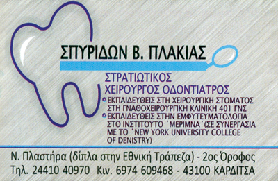 customer tabsΕπικοινωνίαΔέχεται καθημερινά 17:00 -21:00 με ραντεβούΧειρουργοί ΟδοντίατροιΥγείαΝικ. Πλαστήρα 9, ΚαδρίτσαΚΑΡΔΙΤΣΑΘΕΣΣΑΛΙΑ 2441040970 6974609468 Το προτείνω (έχει προταθεί 5 φορές) ΦωτογραφίεςFacebook LikeShare on FacebookTweet Widget