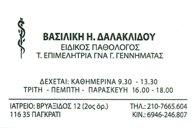 customer tabsΕπικοινωνίαΔέχεται Τρίτη - Πέμπτη - Παρασκευή 16:00 -18:00 με ραντεβούΠρωινές ώρες χωρίς ΡαντεβούΠαθολόγοιΥγείαΒρυαξίδος 12, Παγκράτι, ΑττικήΠΑΓΚΡΑΤΙ ΑΤΤΙΚΗΣΑΤΤΙΚΗΣΤΕΡΕΑ ΕΛΛΑΔΑ 2107665604 6946246807vdalaklidou@yahoo.gr Το προτείνω (έχει προταθεί 0 φορές) ΦωτογραφίεςFacebook LikeShare on FacebookTweet Widget