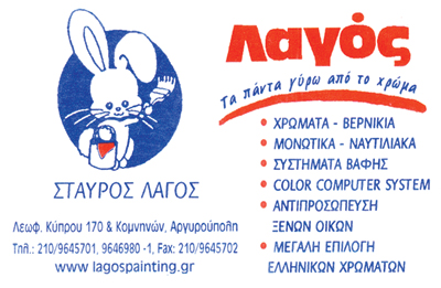 customer tabsΕπικοινωνίαΧρώματα -Βερνίκια - Ταπετσαρίες - Τεχνοτροπίες - ΣιδηρικάΜονωτικά - Υλικά ΘερμοπροσόψεωνΧρώματα και ΒερνίκιαΤαπετσαρίες ΤοίχωνΔόμηση - ΚατοικίαΛ. Κύπρου 170 και Κομνηνών 70, Αργυρούπολη, ΑττικήΑΡΓΥΡΟΥΠΟΛΗ ΑΤΤΙΚΗΣΑΤΤΙΚΗΣΤΕΡΕΑ ΕΛΛΑΔΑ 2109645701 21096469802109645702info@lagospainting.grwww.lagospainting.gr Το προτείνω (έχει προταθεί 0 φορές) ΦωτογραφίεςFacebook LikeShare on FacebookTweet Widget