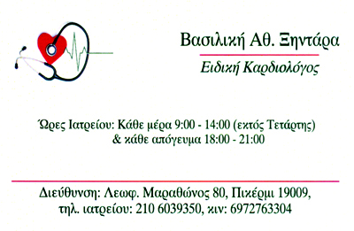 customer tabsΕπικοινωνίαΕιδικός ΚαρδιολόγοςΔέχεται καθημερινά 09:00 -14:00 και 18:00 -21:00Εκτός Τετάρτης Απογεύματος ΚαρδιολόγοιΥγείαΛεωφ. Μαραθώνος 80, Πικέρμι, ΑττικήΠΙΚΕΡΜΙ ΑΝΑΤΟΛΙΚΗΣ ΑΤΤΙΚΗΣΑΤΤΙΚΗΣΤΕΡΕΑ ΕΛΛΑΔΑ 2106039350 6972763304xintara74@yahoo.gr Το προτείνω (έχει προταθεί 0 φορές) ΦωτογραφίεςFacebook LikeShare on FacebookTweet Widget