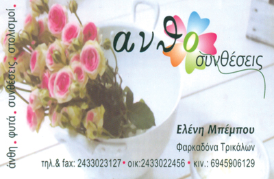customer tabsΕπικοινωνίαΑνθοπωλείαΛοιπάΡήγα Φεραίου 7, Φαρκαδόνα, ΤρικάλωνΦΑΡΚΑΔΟΝΑ ΤΡΙΚΑΛΩΝΤΡΙΚΑΛΑΘΕΣΣΑΛΙΑ 2433023127 69459061292433023127antoimpempou@hotmail.com Το προτείνω (έχει προταθεί 0 φορές) ΦωτογραφίεςFacebook LikeShare on FacebookTweet Widget