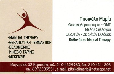 customer tabsΕπικοινωνίαΦυσικοθεραπεύτρια, Ο.Μ.Τ.Μέλος Συλλόγου ΦΥΣΙΚΟΘΕΡΑΠΕΥΤΩΝ-ΧΕΙΡ/ΤΩΝ ΕΛΛΑΔΟΣ. Καθηγήτρια Manual Therapy.Η φυσικοθεραπεία είναι η επιστήμη που ασχολείται με την φυσική αποκατάσταση της υγείας, καθώς επίσης μια σύγχρονη ειδικότητα του παραϊατρικού κλάδου.Αποκαθιστά τη φυσική λειτουργία και την απόδοση του ανθρωπίνου σώματος και προάγει όχι μόνο την σωματική αλλά και την ψυχολογική και κοινωνική υγεία. ΦυσικοθεραπευτέςΥγείαΜαγνησίας 32, Κερατσίνι, ΑττικήΚΕΡΑΤΣΙΝΙ ΑΤΤΙΚΗΣΑΤΤΙΚΗΣΤΕΡΕΑ ΕΛΛΑΔΑ 2104329960 2104311208 69722895512104329960pitsikalimaria65@gmail.compitsikalimaria@netscape.net Το προτείνω (έχει προταθεί 0 φορές) ΦωτογραφίεςFacebook LikeShare on FacebookTweet Widget