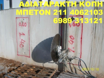 Η εταιρία ZAKO εισήγαγε τηνΑΔΙΑΤΑΡΑΚΤΗ ΚΟΠΗ σκυροδέματος. Μία σύγχρονη τεχνική στις κατεδαφίσεις, καθαιρέσεις και κοπές του μπετόν χωρίς θόρυβο και χωρίς σκόνη.Η ZAKO έχει πετύχει μια σταθερά ανοδική πορεία, αυξάνοντας καθημερινά τον όγκο εργασιών της. Παρέχει ολοκληρωμένες τεχνικές λύσεις, επιτυγχάνοντας ταυτόχρονα ταχύτατους ρυθμούς εκτέλεσης, στη πιο κοντινή σχέση κόστους και αποτελέσματος. Με εξειδίκευση και συνέπεια μπορεί και ανταγωνίζεται με σταθερή αξία τη σχετική με το είδος αγορά Η εταιρία μας είναι εξοπλισμένη με την τελευταία λέξη της τεχνολογίας, ενώ τα εξειδικευμένα εργαλεία που διαθέτουμε, καλύπτουν απόλυτα οποιαδήποτε ανάγκη στο χώρο ΑΔΙΑΤΑΡΑΚΤΗ ΚΟΠΗ ΜΠΕΤΟΝ, ΔΙΑΤΡΗΣΗ ΜΠΕΤΟΝ καθώς και ενισχύσεις κτηρίων. Η εταιρία μας είναι πρωτοπόρος εταιρία στο χώρο ΑΔΙΑΤΑΡΑΚΤΗ ΚΟΠΗ ΜΠΕΤΟΝ, ΔΙΑΤΡΗΣΗ ΜΠΕΤΟΝ. Οι υπηρεσίες μας - Στρογγυλές οπές για σωληνώσεις-Η εταιρία έχει την τεχνολογία καθώς και την τεχνογνωσία διάνοιξης οπών σε όλα τα δομικά υλικά. - Διανοίξεις σε κάθετες επιφάνειες για καινούριες πόρτες και παράθυρα Τετράγωνες οπές για ανελκυστήρες και κλιμακοστάσια Η εταιρία εξοπλισμένη με τα πλέον σύγχρονα μηχανήματα σε συνδυασμό με το έμπειρο προσωπικό έχει την δυνατότητα κοπής όλων των δομικών υλικώνσε οποιοδήποτε πάχος. Συρματοκοπή Ανθρακονήματα - ΥαλοϋφάσματαΤσιμεντενέσεις - Ρητινενέσεις Κοπή τυφλού τμήματος οπλισμένου μπετόνΓενικευμένη χρήση μέσων αδιατάρακτης κοπής για την ελεγχομένη κατεδάφιση κτιρίων ή μέρους αυτών.Αναλαμβάνουμε σε όλη την Ελλάδα κάθε τεχνική εργασία και εξυπηρετούμε κάθε ανάγκη της Αδιατάρακτη Κοπη και Διάτριση μπετόν σε πολυκατοικίας, του διαμερίσματος σας ή του επαγγελματικού χώρου σας, οπως εργοστασια και παρκιν. Αποξήλωση των παλαιών (μεσοτοιχίες, κουζίνες, μπάνια, πόρτες & κουφώματα, δάπεδα / πατώματα, κλπ.)ΦΤΗΝΟΤΕΡΗ ΠΡΟΤΑΣΗ ΣΤΗΝ ΑΓΟΡΑ Οι δραστηριότητες μας δεν περιορίζονται στην Αττική όπου εδρεύει, αλλά επεκτείνονται σε όλη την Ελλάδα. Το γραφείο μας, σε οποιαδήποτε κλίμακα έργου, διαθέτει συνέπεια, ταχύτητα, ποιοτική εκτέλεσης εργασιών και χαμηλό κόστος.