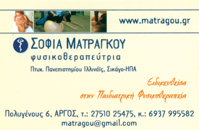 customer tabsΕπικοινωνίαΑθλητικές Κακώσεις, Ρευματολογικές Παθήσεις, Νευρολογικές ΠαθήσειςΠαθήσεις Σπονδυλικής στήλης, Manual Therapy,Θεραπείες Κατ΄οίκον,Ως φυσικοθεραπεία ονομάζουμε τη θεραπευτική προσέγγιση - αγωγή που χρησιμοποιεί φυσικά μέσα για να παρέχει την κατάλληλη θεραπεία. Με αυτό, ως γνώμονα, οργανώσαμε ένα άρτια εξοπλισμένο φυσικοθεραπευτήριο με στόχο να προάγουμε την υγεία και την ευεξία κατά τον καλύτερο τρόπο. Η γνώση και η εμπειρία μας σε συνδυασμό με το φιλικό περιβάλλον δίνουν τη δυνατότητα αποκατάστασης μεγάλης γκάμας περιστατικών.Αναλαμβάνουμε περιστατικά όπως:Άκανθα πτέρναςΑυχενικό σύνδρομοΑγγειακά Εγκεφαλικά ΕπεισόδιαΑρθρίτιδαΔισκοπάθεια - ΔισκοκήλεςΕγκεφαλικό επεισόδιο - ημιπληγίαΣκολίωσηΛεμφοίδημαΟστεοπόρωσηΟσφυαλγίαΠάρκινσονΡήξη - κάκωση: Μηνίσκου, Προσθίου χιαστού, Οπίσθιου χιαστού, Πλαγίων συνδέσμων, Συνδέσμων ποδοκνημικής Χονδροπάθεια επιγονατίδοςΣκλήρυνση κατά πλάκαςΣυμβεβλημένο Ιατρείο ΕΟΠΥΥ ΦυσικοθεραπευτέςΥγείαΠολυγένους 6, Άργος, ΑργολίδαΑΡΓΟΣ ΑΡΓΟΛΙΔΑΣΑΡΓΟΛΙΔΑΠΕΛΟΠΟΝΝΗΣΟΣ 2751025475 6937995582matragou@gmail.com Το προτείνω (έχει προταθεί 1 φορές) ΦωτογραφίεςFacebook LikeShare on FacebookTweet Widget