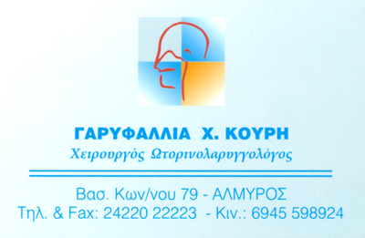 customer tabsΕπικοινωνίαΧειρ. Κεφαλής και ΤραχήλουΔέχεται καθημερινά 09:00-13:00 , 17:00 -20:00 (Τρίτη-Πέμπτη- ΠαρασκευήΩτορινολαρυγγολόγοιΥγείαΒασ. Κωνσταντίνου 79, Αλμυρός, ΜαγνησίαΑΛΜΥΡΟΣ ΜΑΓΝΗΣΙΑΣΜΑΓΝΗΣΙΑΘΕΣΣΑΛΙΑ 2422022223 6945598924garykouri@yahoo.gr Το προτείνω (έχει προταθεί 0 φορές) ΦωτογραφίεςFacebook LikeShare on FacebookTweet Widget